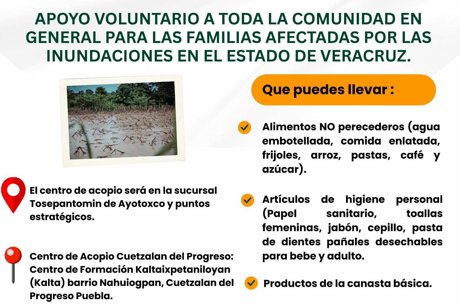 Centro de acopio: Yoltlajtoli Radio, en la comunidad de Colatlán, Ixhuatlán de Madero, Veracruz.