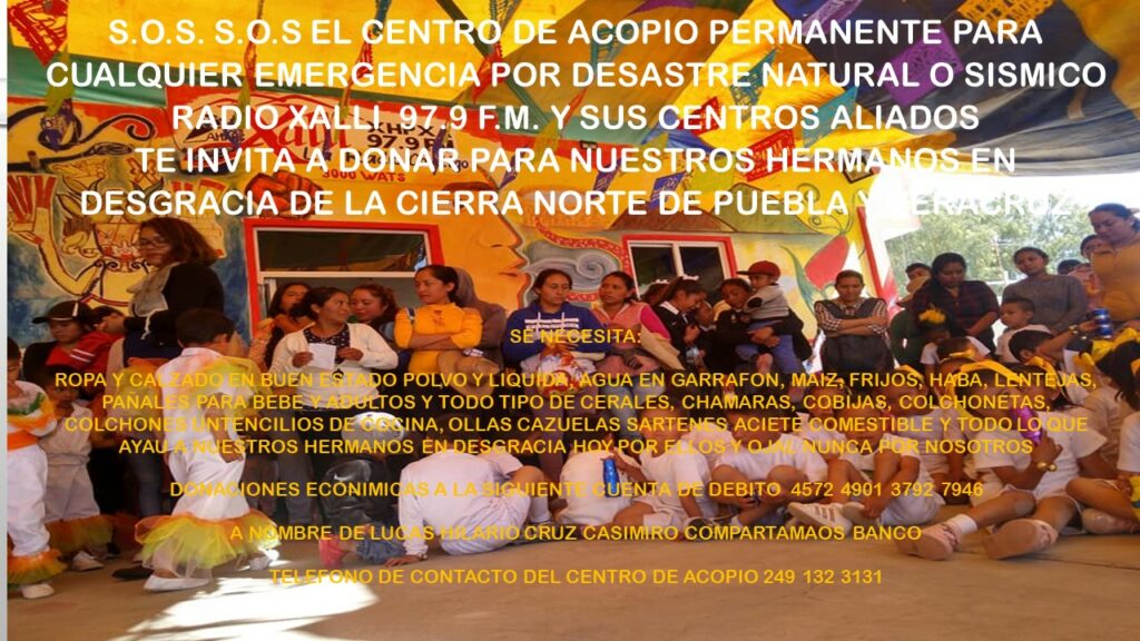 Radio Xalli 97.9 FM. Centro de acopio permanente para cualquier emergencia por desastre natural o sísmico, en la comunidad de San Miguel Xaltepec, Municipio de Palmar de Bravo, Puebla.